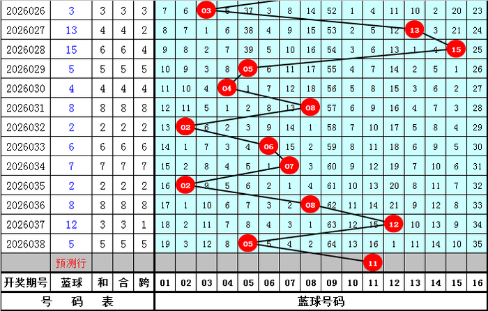 蓝球分析:去年第039期蓝球奖号为11,开出2路蓝球,今年同期注意2路蓝球继续开出,参考蓝球11。